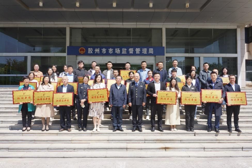 集团一行5人手持顾问单位牌匾在市场监管局门前合影